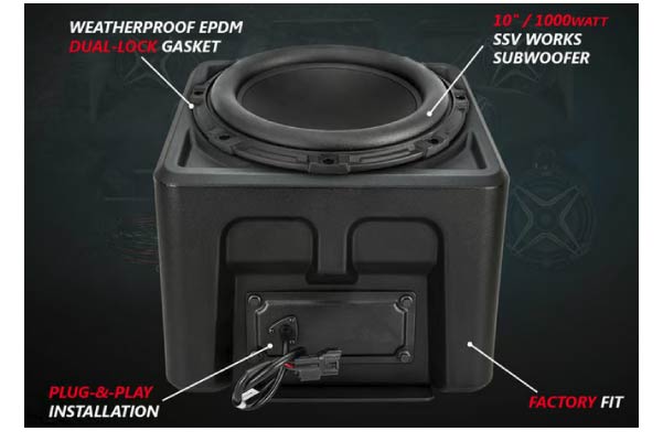 • Includes a marine receiver, two loaded 6.5” speakers enclosures, a 5-channel Amplifier, and a loaded 10" subwoofer enclosure
